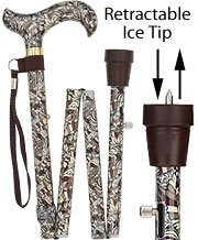 Style and safety will go hand in hand with this beautifully patterned folding aluminum walking cane. The sturdy rubber tip features an innovative retractable ice tip perfect for winter and summer months alike. Unlike many ice tips, the cane features a metal pin on the shaft for adjusting the ice pick which allows you to avoid having to touch the actual tip. The comfortable derby handle provides a secure grip and is patterned to match the shaft perfectly. Our Bahama Leaf pattern is perfect for men or women with it's earth tone colors of brown, taupe, and olive green. Last, but not least this walking cane is adjustable in height and can be folded down for simple storage.