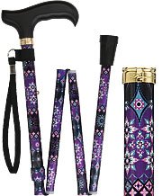 An assortment of simple geometric shapes are arranged into a vibrant, intricate pattern contrasting over a dark background to create this look that really comes alive. Part of our High-Definition line of designer walking canes, this piece was created using a special, high-tech printing method to ensure its meticulous, highly detailed pattern and long-lasting beauty. Complete with a comfortable derby-style handle and an elegant, engraved metal collar, this is a cane that you will love to own for years to come. Place your order today! Includes a comfortable wrist strap. Constructed of lightweight materials. Folding and adjusting mechanisms are sturdy and east-to-use.